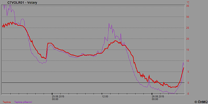 Nejvyšší minimum zaznamenala 26. srpna ráno stanice Nicov s minimem 11,8°C, na ostatnich šumavských stanicích se ranní minima pohybovala většinou mezi 5°C a 10°C.