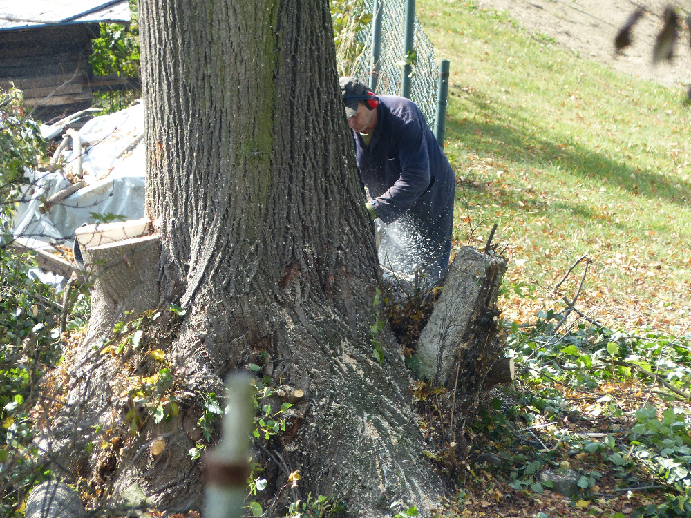 A tak když nastala akce kácení, vzala jsem fotoaparát a šla si, ze sousedního pozemku, vyfotit práci dřevařů, kterou obdivuji a chtěla jsem se o foto s vámi podělit. Ve chvíli, kdy už byly ‚výškové práce‘ hotové a byla plošina pryč, jsem poslala syna pro tři malé výhonky, do vázy, na památku. Pak přišel zlatý hřeb, poražení kmene i s nějakými zbylými větvemi. Majitelům pozemku ani dělníkům se sice příliš nelíbilo, že práci dokumentuji (což komentovali nepublikovatelnými výrazy na mou adresu), nicméně rozloučení s takovým „kolosem“ podle mě za zachycení určitě stojí – posuďte sami z fotografií. Tím spíš, že obvykle se takhle vzrostlé stromy v zástavbě kácejí ne vcelku, ale po částech se krátí na menší polena tak, aby padala k jeho patě a teprve „bezpečná výška“ se pokládá.