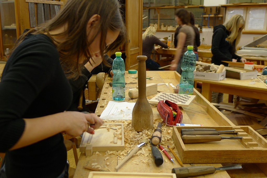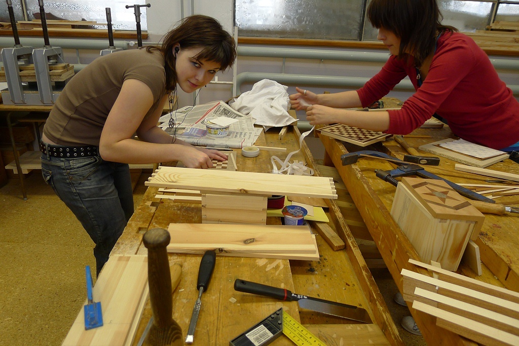 V roce 1975 maturoval na SPŠ ve Volyni Pavel Kříž, dnes předseda zmíněného družstva. Se školou zůstal v kontaktu a dlouhodobě s ní spolupracuje, proto se, když potřeboval reprezentativní a stylový dárek, obrátil právě na ni. Šachy jsou výsledkem celoroční práce Marie Švarcové, Moniky Zápotocké a Kamily Pipkové, dnes již absolventek oboru design interiéru. Když byly ve druhém ročníku, dostala celá jejich třída zadání ročníkové práce – navrhnout a vyrobit šachovnici o rozměrech 60 x 60 cm se dvěma sadami figurek. Jelikož se jednalo o časově náročný projekt, pracovali všichni ve skupinách. Měli uplatnit svoji kreativitu, zručnost a již získané dovednosti, prostě všechno, co daný obor vyžaduje. Kreslili, navrhovali, intarzovali, soustružili, řezbařili, až se z javorového a ořechového dřeva zrodilo několik naprosto originálních a jedinečných šachových sad.
