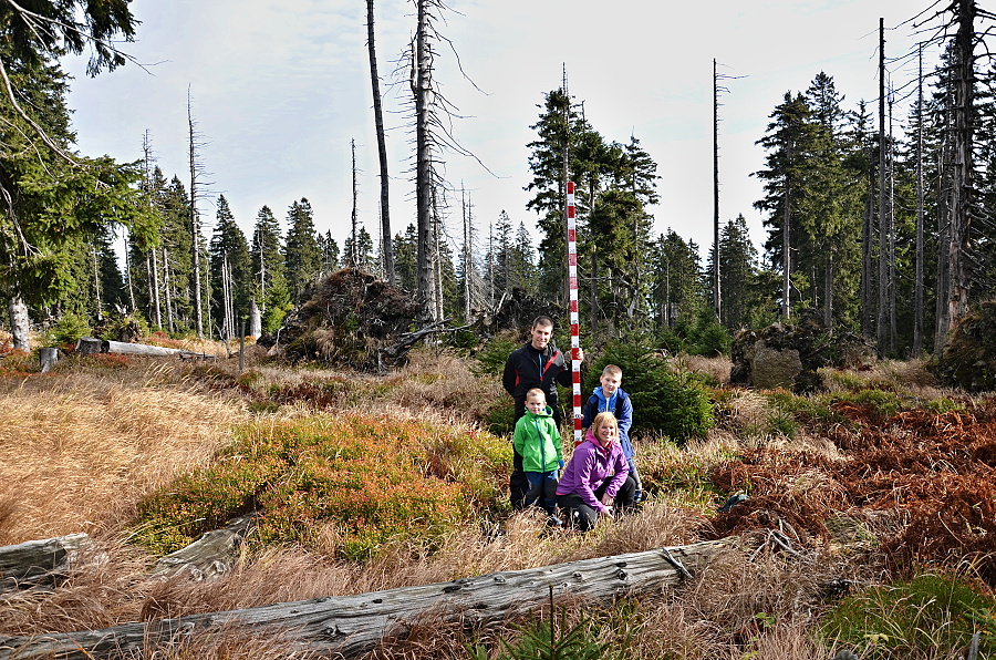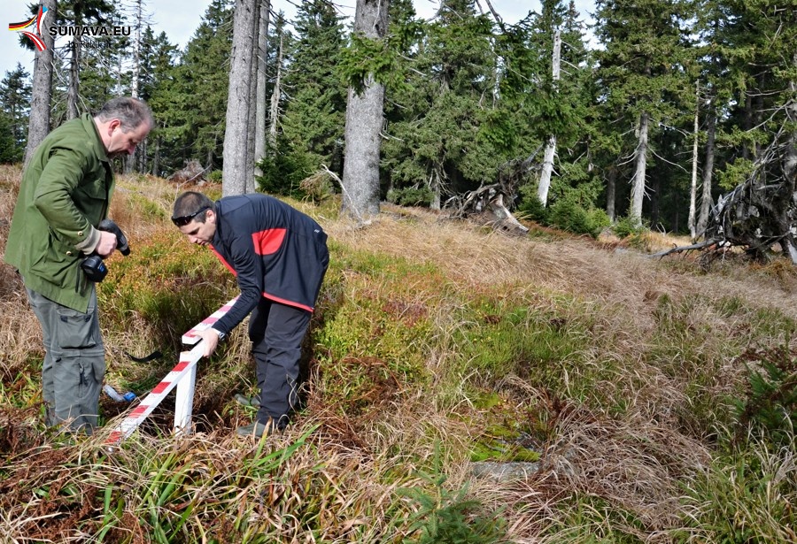Nejrychlejší a pro dopravu komponent a k instalaci nutného nářadí bylo nejjednodušší zvolit cestu autem k hlavnímu parkovišti lyžařského střediska a následně s nářadím vystoupat přes 400 výškových metrů po sjezdovce. K tomu jsme si ovšem vzali zdatné mladé pomocníky, tudíž jsme byli se vším záhy na vrcholu. Místo bylo vybráno dále od samotného vrcholu, aby nebylo tolik ovlivněno větrem a zároveň aby bylo možné odhadnout výšku sněhu z panoramatické vrcholové kamery. Instalovaná sněhoměrná lať měří i s nástavcem rovné 3 m a nachází se v nadmořské výšce 1330 m. Blízko vrcholu a menší meteorologické stanice Správy NP Šumava je ještě jedna sněhoměrná lať, která je vysoká přibližně 2,5 m se značením do 2m, ovšem ta z kamery vidět není. Jako záložní pro odečítání výšky sněhu z kamery jsme opravili a označili i jednu vyvrácenou železobetonovou také téměř 3m vysokou hraniční tyč. Cestou zpět se nám naskytly krásné výhledy na hlavní hřeben Trojmezenské hornatiny, zamlžená údolí nebo barevné smíšené lesy rakouské Šumavy, ze kterých vítr nenávratně odnášel letošní listy. Zima se nezadržitelně blíží, doufejme, že 3m vysoké sněhoměrné latě na vrcholu Smrčiny ji řádně zdokumentují a pomohou tak zdokonalit monitoring výšky sněhu hřebenových partií Šumavy.