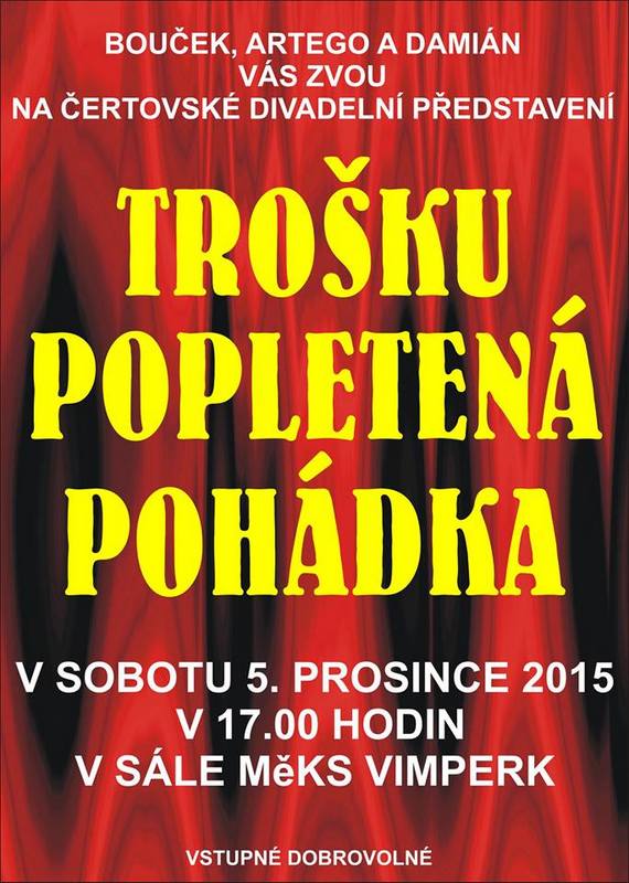 Dnešní den je určen čertům, andělům a nemůžeme zapomenout na dobráckého Mikuláše. Ať už máte mikulášskou družinu pozvanou přímo k vám domů, nebo se s dětmi půjdete projít jen ulicemi Vimperka, máte možnost přijít se pobavit na mikulášskou pohádku pod názvem Trošku popletená pohádka.