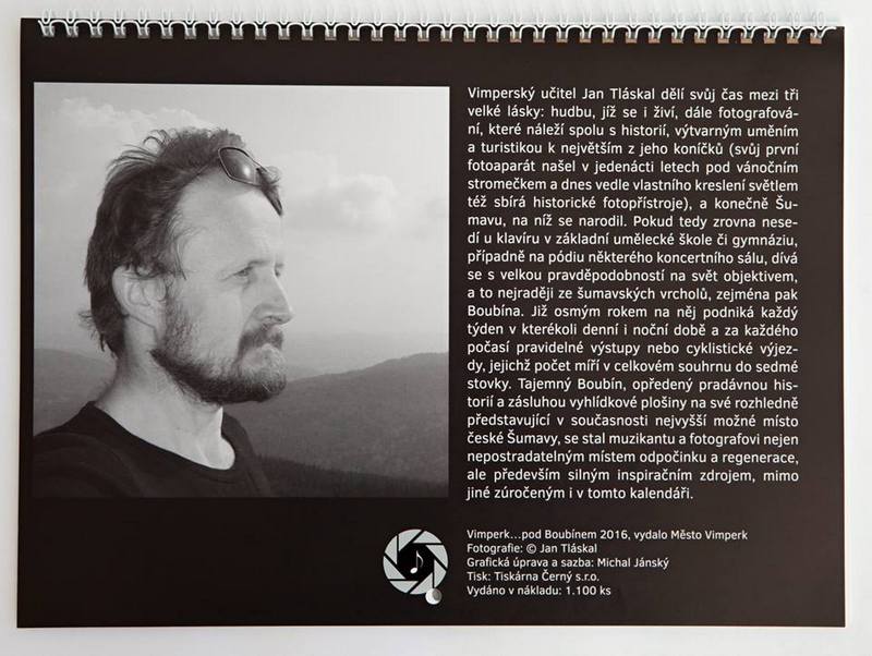 „Vimperk pod Boubínem“ je hlavním tématem fotografií, které tvoří nový kalendář pro rok 2016 vydaný městem Vimperk v nákladu 1 100 kusů. Autor snímků, vimperský fotograf Jan Tláskal, zachytil své město s okolní krajinou v různých ročních obdobích a z různých pohledů.