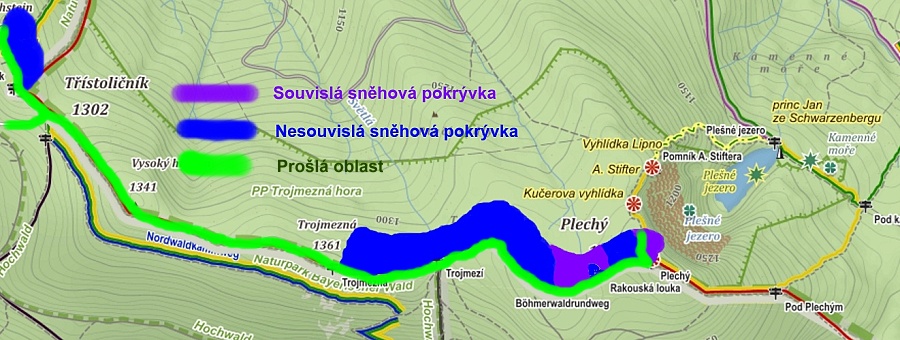 Od Trojmezné k Trojmezí tří států leží nesouvislá sněhová pokrývka jen na české straně, tedy na severním svahu hřebenu. Německá a poté rakouská část hřebene v okolí Trojmezí je beze sněhu, to platí i pro vrchol Hufberg. Souvislá sněhová pokrývka leží jen na ploše několika hektarů v oblasti Rakouské louky v lesním porostu na české straně, u samé hranice a na rakouské straně je sníh zcela roztátý. Okolí vrcholu Plechý je z rakouské strany také zcela beze sněhu, sníh leží na české straně vrcholu, i zde však jsou vytátá místa, sněhová pokrývka dosahuje přibližně 60% plochy.
