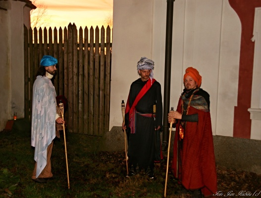 Na foto sobotní zkouška na nedělní program v Mlázovech – odpoledne od 14 hodin se můžete projít jarmarkem, od 15 do 17 hodin být účastníky tvořivé dílničky pro celou rodinu (zdobení perníčků hrátky s ovčí vlnou), od 16 do 17 hodin se vydat za svitu svíček na podvečrní prohlídku zámeckým parkem a od 17 hodin bude pro všechny připraven živý Betlém s videoprojekcí před mlázovským kostelem.