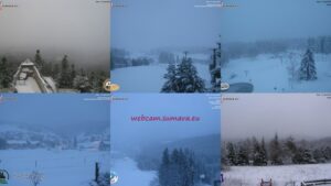 Od 9 hodin bude rolba upravovat běžkařské trasy. Aktuálně Modravsko Teplota -0,4 stupně, zataženo, sněžení, připadlo zhruba 10 cm nového sněhu,