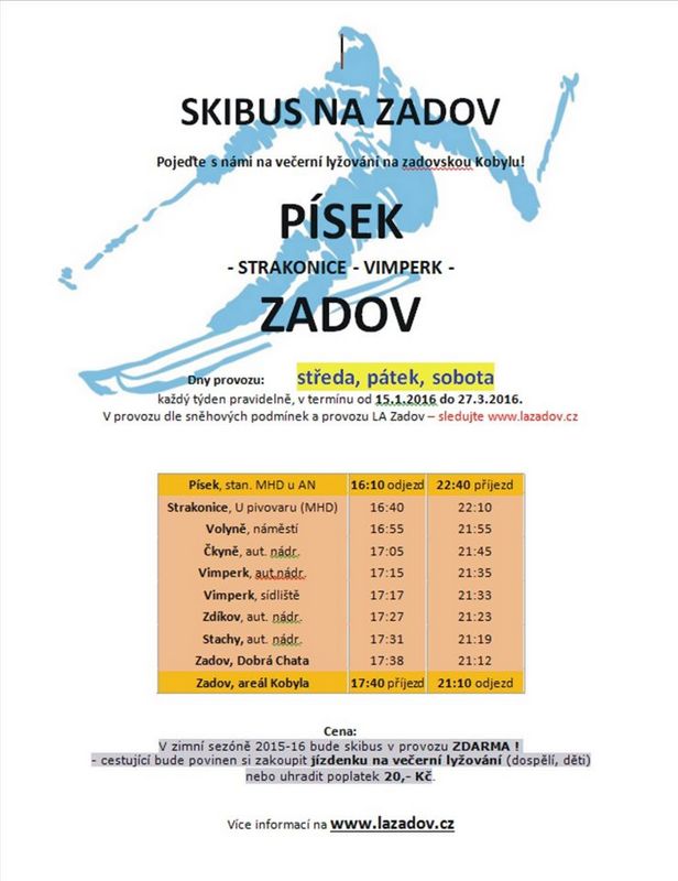 Konkrétně na Skibus. Ten doveze sjezdaře na Zadov až z Písku. Svozy Skibusem ve středu, v pátek a v sobotu na trase Písek – Strakonice – Vimperk – Zadov, fungují již nyní, od pátka 15.1. bude svoz Skibusem i na večerní lyžování.