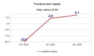 Po silných mrazech, které dosáhly maxima v pátek 22. ledna, došlo během následujích dvou dnů k velmi výraznému oteplení. 22. ledna se ranní teplota na