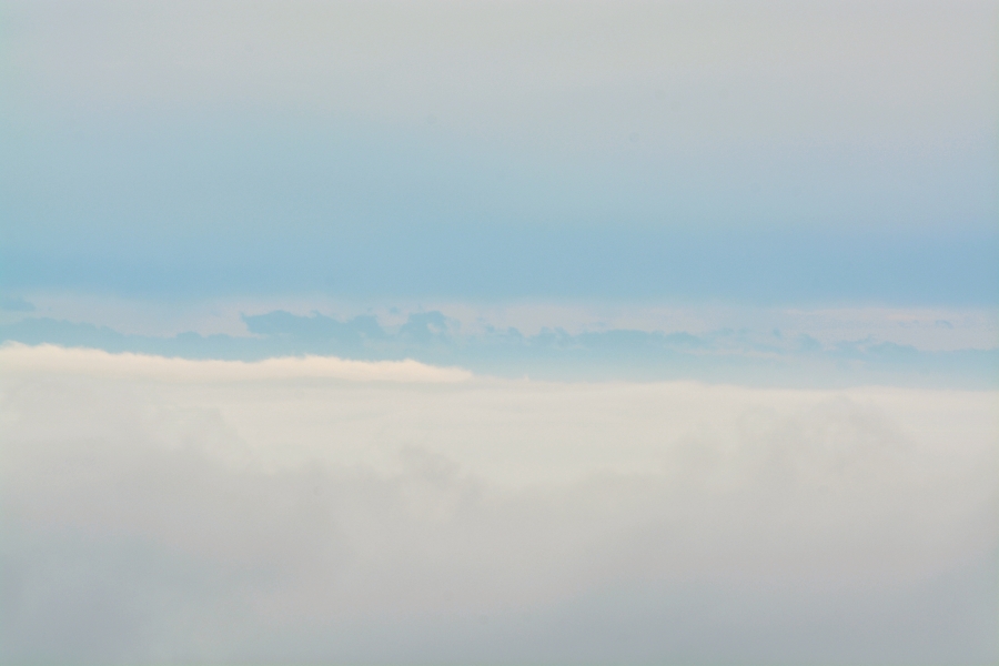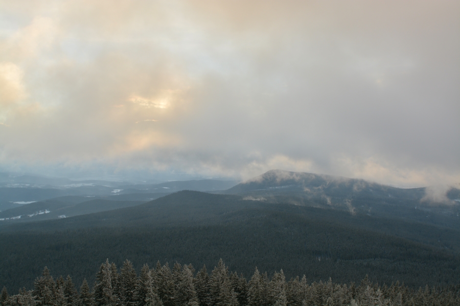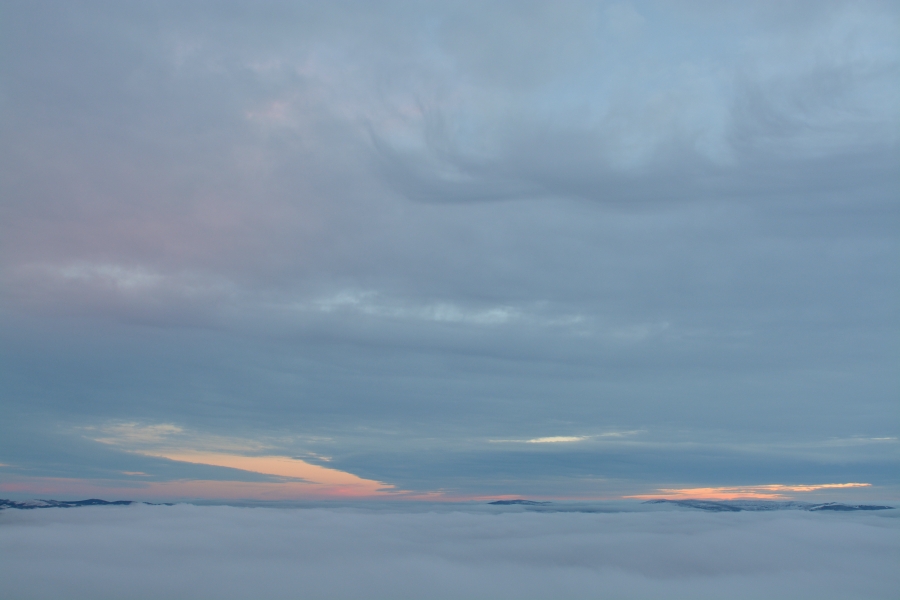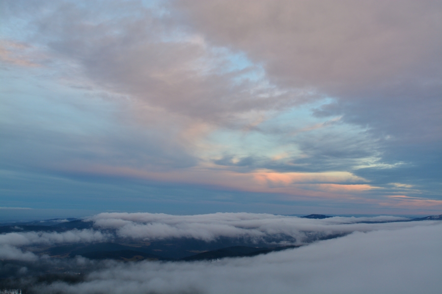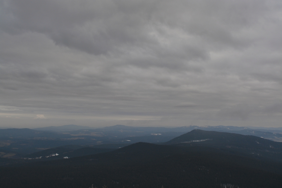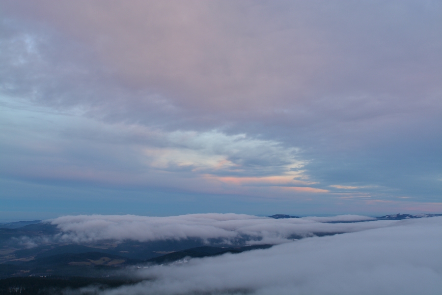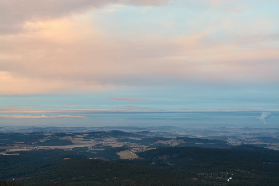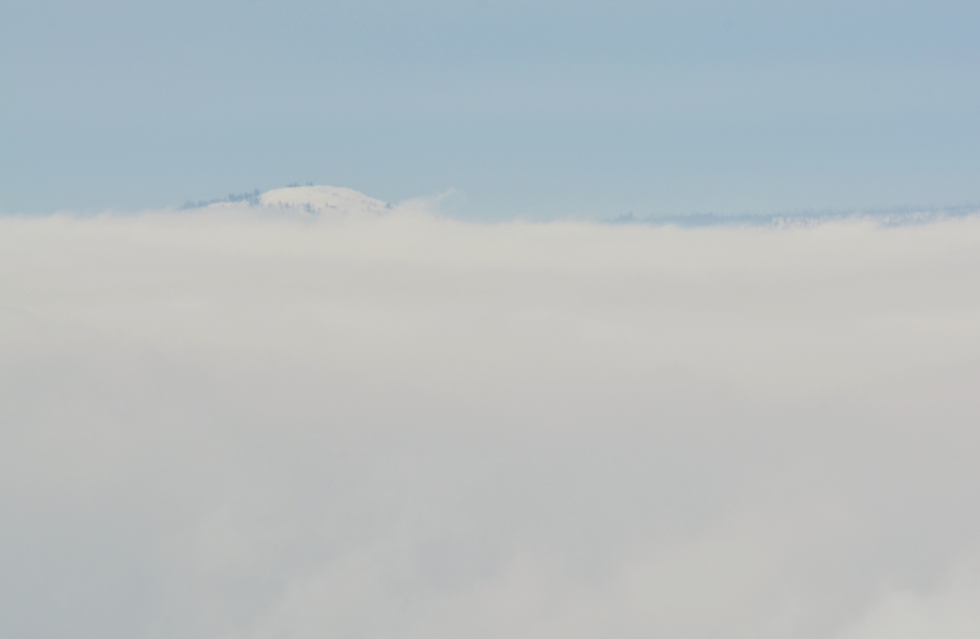 … jíž jednoznačně dominovala mohutná inverzní hladina, dokonale ukrývající s výjimkou jižní části celý obzor. Zde se zrovna „vaří“ nad Bobíkem, nicméně jeho vrchol byl i za naprostého klidu neviditelný, z čehož lze usoudit, že výše oné neprůhledné jednolité bílé masy momentálně dosahuje bohatě ku třinácti stům nadmořských metrů, ba možná je i překračuje.