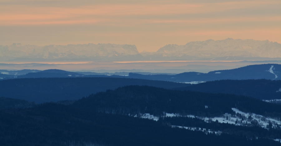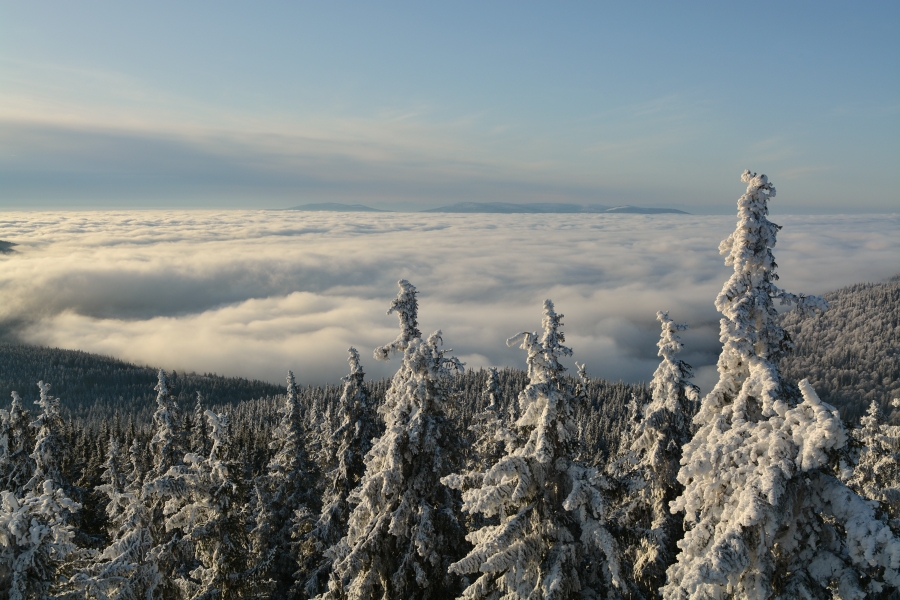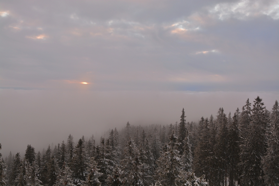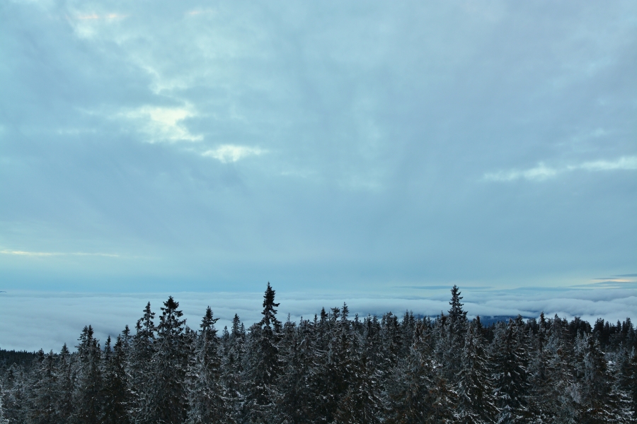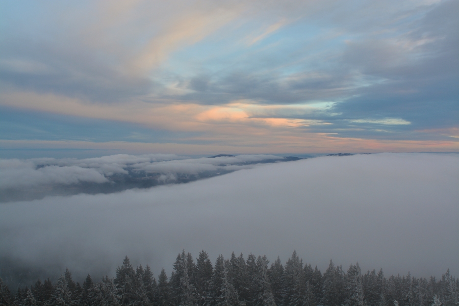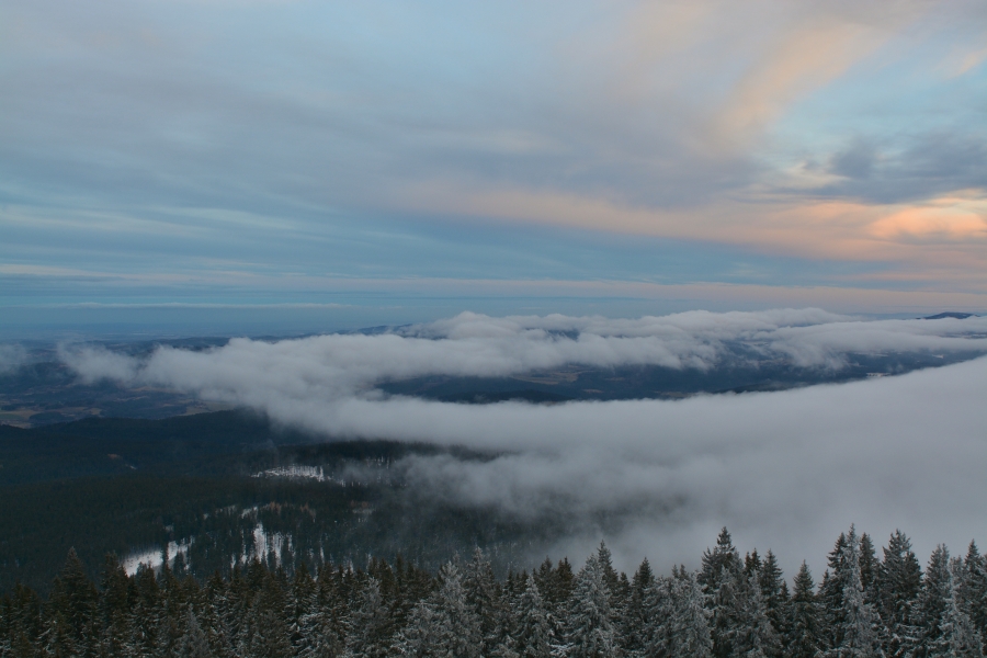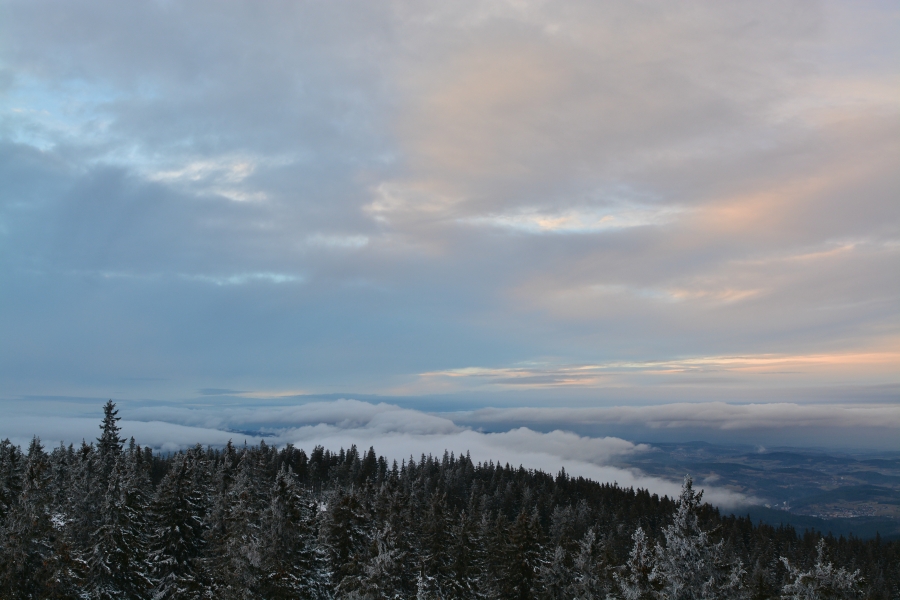 … neboť totožnost případných vysvobozených alpských velikánů se i za použití delšího skla určovala jen velmi těžko, zcela bez záruky. V každém případě však bylo možno konstatovat, že na boubínském vrcholu je už jen oproti úpatí, o nižších partiích nemluvě, přímo zlatě. Teploměr ukazoval jeden stupeň nad nulou, po celém obzoru se dala zahlédnout modrá obloha a všemu vládla poctivá snaha sluníčka zdolat oblačnou bariéru, jež mu bohužel přebohatě stála v cestě. Jelikož se navíc pohříchu zdála sílit a od západu počala do modrého meziprostoru mezi ní a inverzní hladinou lehce proudit čerstvá mlha, vyvstala zákonitá otázka po dalším vývoji situace. Nabízely se dvě mnohokrát zde již střídavě proběhlé varianty: buď poklesne teplota, zesílí vítr a vlivem obojího přece jen dojde aspoň k částečnému vysvobození nejvyšších horských vrcholů (možná včetně některých alpských), nebo naopak zvítězí mlha a zahalí vše, co ještě bylo jakž takž k vidění.