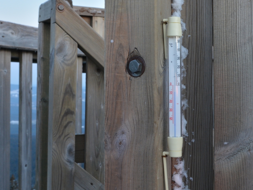 … nás o tom přesvědčí teploměr. Pokles o pět stupňů oproti včerejšku byl skutečně i pocitově znát, a to již cestou vzhůru – Vimperk chvíli před ní vykazoval čtyři stupně nad nulou, Kubovka už jen jeden a půl stupně a sestupná tendence směřující k finálním osmi stupňům pod nulou byla s každým výškovým kilometrem zřetelnější.