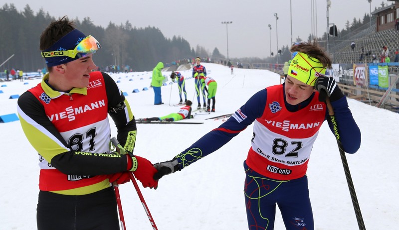 Ondra Mánek, kterému blahopřeje po nedělním závodě vyčerpaný Štěpán Machač ze silného biatlonového oddílu v Jablonci, který skončil v republikovém žebříčku druhý za Ondoru.