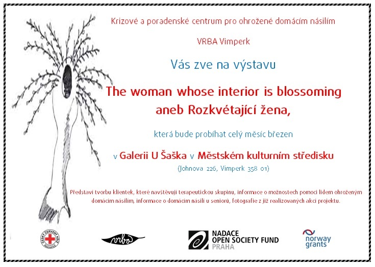 The woman whose interior is blossoming aneb Rozkvétající žena, to je název březnové výstavy v Galerii U Šaška v Městském kulturním středisku Vimperk. Příchozím představí nejen tvorbu klientek, které navštěvují terapeutickou skupinu, její součástí jsou také informace o možnostech pomoci lidem ohroženým domácím násilím, o domácím násilí u seniorů nebo fotografie z již realizovaných akcí projektu. Výstavu připravil tým projektu VRBA Vimperk – Krizového a poradenského centra pro ohrožené domácím násilím, který je podpořen Nadací Open Society Fund Praha z programu Dejme (že)nám šanci financovaného z Norských fondů.