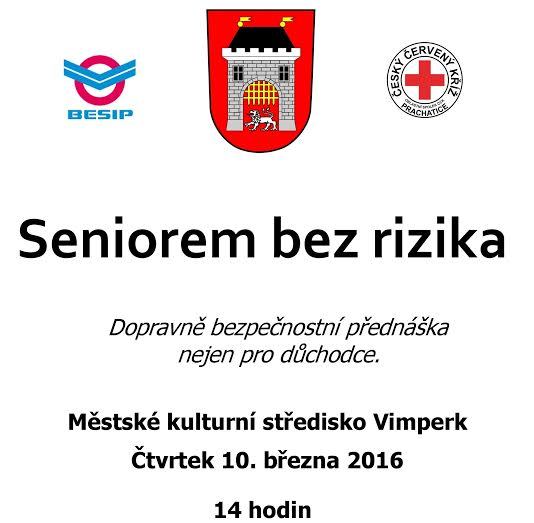 Město Vimperk a Městská policie Vimperk Vás srdečně zvou na dopravně bezpečnostní přednášku Seniorem bez rizika, která se koná ve čtvrtek 10. března od 14.00 hodin v sále MěKS. Účastníci získají nové informace o povinnosti chodců nosit reflexní prvky, naučí se základům první pomoci při fyzickém napadení a dozví se více o dostupných sociálních službách ve městě. Jako hosté vystoupí Václav Kovář, krajský koordinátor BESIP, Martina Joklová, Policie ČR, Zuzana Pelikánová a Martina Bártová, ČČK, Oblastní spolek Prachatice.