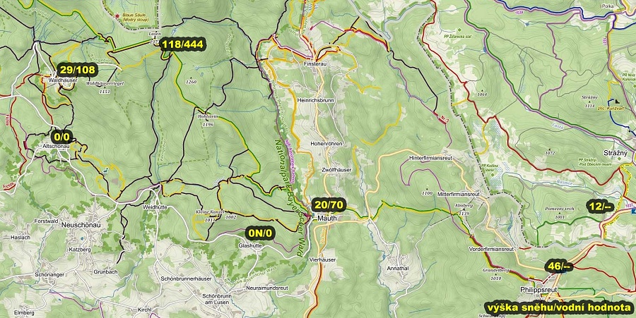 Cestou jsme provedli odpočet výšky sněhu ve Strážném, kde ráno leželo 12 cm sněhu a v nedalekém Philippsreutu téměř 4 krát více sněhu, přesněji 46 cm. Na těchto dvou lokalitách jsme vodní hodnotu tentokrát neměřili.