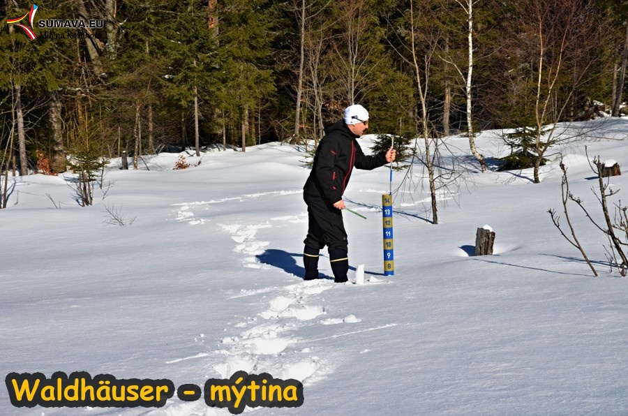 Následovalo měření přímo v obci Mauth, v nadmořské výšce 770 metrů, kde leželo 20 cm sněhu a vodní hodnota byla 70 mm. V nedaleké obci Glashütte nás překvapilo, že zde žádný sníh není, ani v další obci Altschönau tomu nebylo jinak. Další zastávkou byla nejvýše položená obec v Bavorském lese a to Waldhäuser, kde bylo provedeno měření v horní části obce v nadmořské výšce 1010 metrů, kde na slunné jižní stráni leželo 29 cm sněhu a vodní hodnota činila 108 mm.