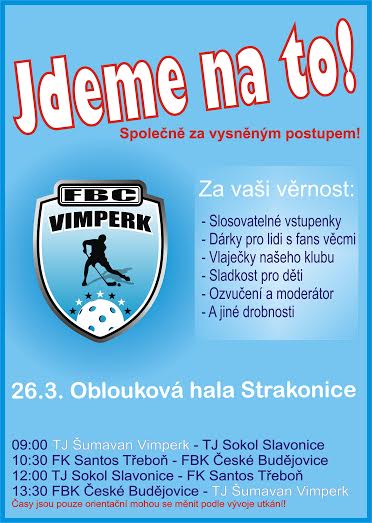 Vážení vimperští občané a příznivci florbalového sportu. Srdečně vás zveme na domácí turnaj, který se uskuteční 26. 3. 2016 v obloukové hale ve Strakonicích. První utkání sehrajeme od 9:00 a druhé přibližně v 13:30. Jelikož nás těší zájem kolující mezi lidmi v našem městě, rozhodli jsme se Vás odměnit. Připravili jsme pro Vás slosovatelné lístky za dobrovolné vstupné, sladkosti pro děti, dárky pro lidi s fans předměty a další malá překvapení. Chceme bojovat o postup před Vašimi zraky, přijďte nás podpořit!!