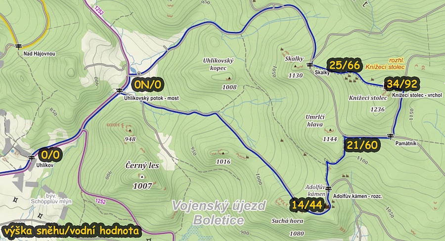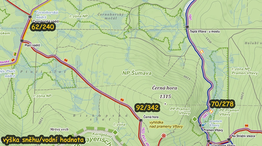 Souběžně s měřením v okolí Knížecího stolce proběhly náměry na běžkaři oblíbené trase u Pramenů Vltavy, kde leží vrstva sněhu 70 cm, čerstvě projetá stopa tak slibuje i nadále ideální podmínky pro běžkaře. Na nedaleké Černé hoře leží necelý metr sněhu, prameniště Teplé Vltavy má až 342 litrů vody ve sněhu v každém metru čtverečném.