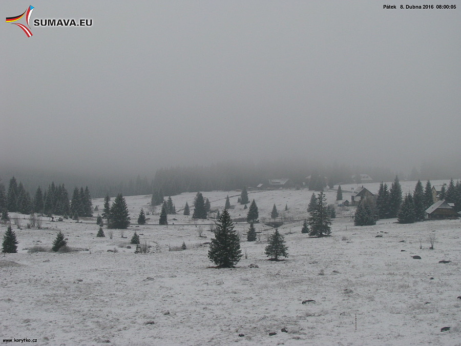 V noci na 8. dubna se ochladilo a v polohách nad 1000 m n.m. napadly až 2 cm nového sněhu. Díky teplotám kolem bodu mrazu je sníh mokrý a pomalu odtává. Více jak půlmetrová vrstva sněhu leží jen na hraničních hřebenech, i zde za poslední týden odtálo kolem 30 cm sněhu.