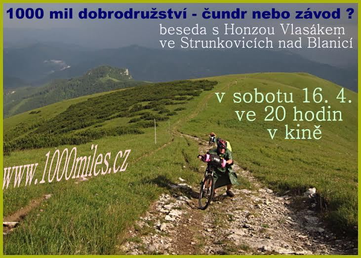 Dovolujeme si vás tímto pozvat tuto sobotu 16. dubna do kina ve Strunkovicích nad Blanicí, kde se od 20:00 hodin uskuteční cestovatelská přednáška Honzy Vlasáka “ 1000 mil dobrodružství – čundr nebo závod?“.
