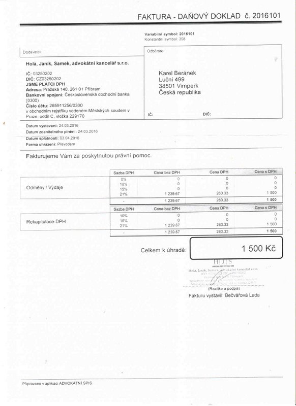 Vyúčtování od advokátní kanceláře Holá, Janík, Samek, jejichž služby jsem si objednal při podání vysvětlení na Policii ČR kvůli trestnímu oznámení nejen na moji osobu. Nemám důvod nic tajit, nebo se schovávat, jak napsal jeden jistý…