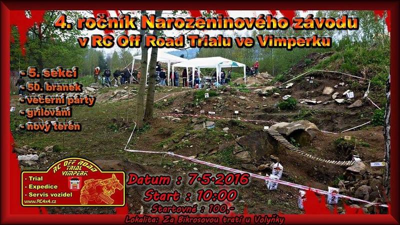 Dne 7.5.2016 se uskuteční od 10:00 hodin 4. ročník závodů terénních RC modelů na Trialové dráze za Bikrosovou tratí ve Vimperku. Závody spočívají v projetí 5. ohraničených sekcí. Každá sekce obsahuje 10 branek, takže každé vozidlo musí absolvovat celkem 50 branek umístěných v náročném terénu, stejně jako se jezdí v republice Truck Trial. Vyhrává vozidlo s co nejmenším počtem bodů. Trestné body se sbírají za doteky a přerážení branek, ale také i za couvání, tudíž záleží na šikovnosti každého jezdce, jakou zvolí strategii v průjezdu i v dobrém najíždění si do daných branek. A také hodně na technice a její připravenosti s kterou samotný závod odstartuje. Mimo závod bude k vidění i pár rychlejších modelů a jiných aut, kteří si plno soutěžících vozí s sebou na odreagování a „zablbnutí“ na přilehlé Bikrosové trati.