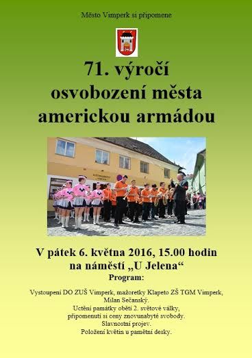 Uctěním památky obětí druhé světové války si město Vimperk v pátek 6. května v 15.00 hodin na náměstíčku „U Jelena“ slavnostně připomene osvobození americkou armádou. Oslavy budou pokračovat v sobotu 7. května ve 14.00 hodin na náměstí Svobody ukázkou zbraní a techniky při bojových akcích. K dobré pohodě zahrají Dixie Old Boys a čepovat se bude speciální pivo Generál Patton. Jste srdečně zváni.