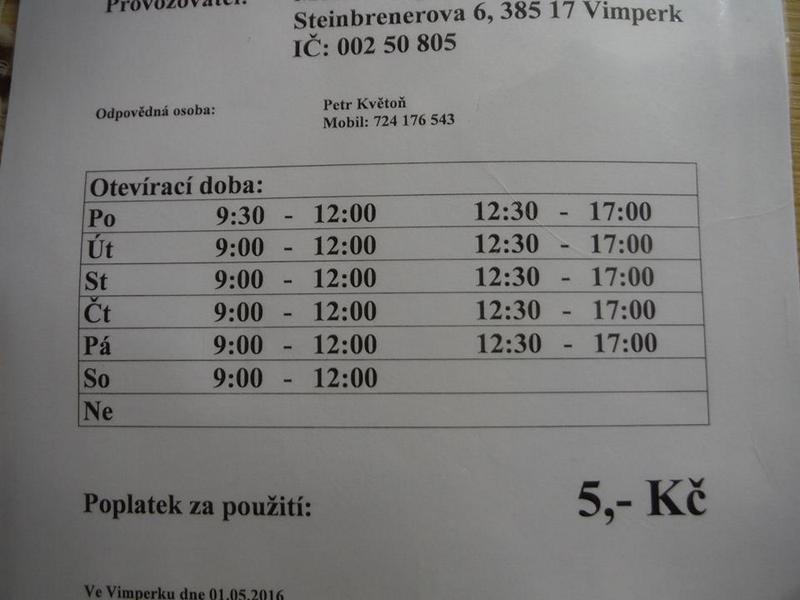 Od 1. května je opět otevřeno veřejné WC pod schody do parku. Záchody budou v provozu po celou turistickou sezónu až do konce září. O jejich čistotu i bezchybné fungování se postará Hana Suchá. Poplatek činí 5 Kč.