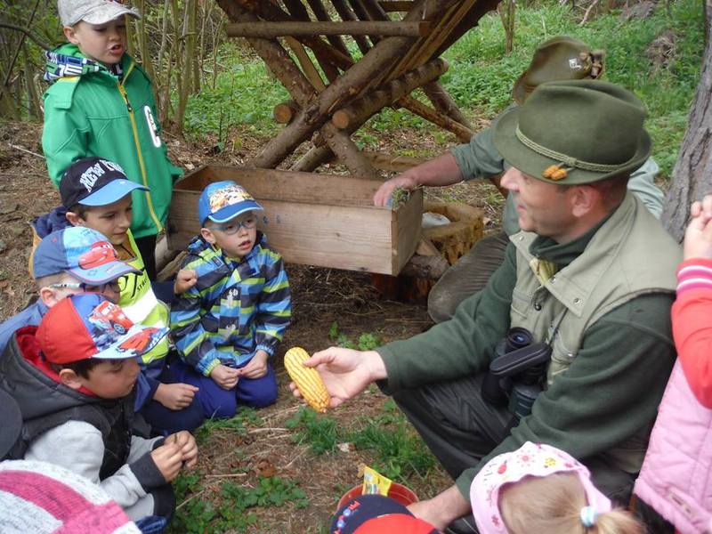 Ve středu 11. května se myslivci Bohumil Cais a Ladislav Levanský sešli s předškoláky z MŠ Klostermannova u krmelce v Hrabicích. Děti se dozvěděly čím, jak a kdy se přikrmují volně žijící zvířata a vyzkoušely si některé myslivecké dovednosti. „Pro děti je to vždycky zážitek, na který se moc těší,“ potvrzuje učitelka Kateřina Gálová.