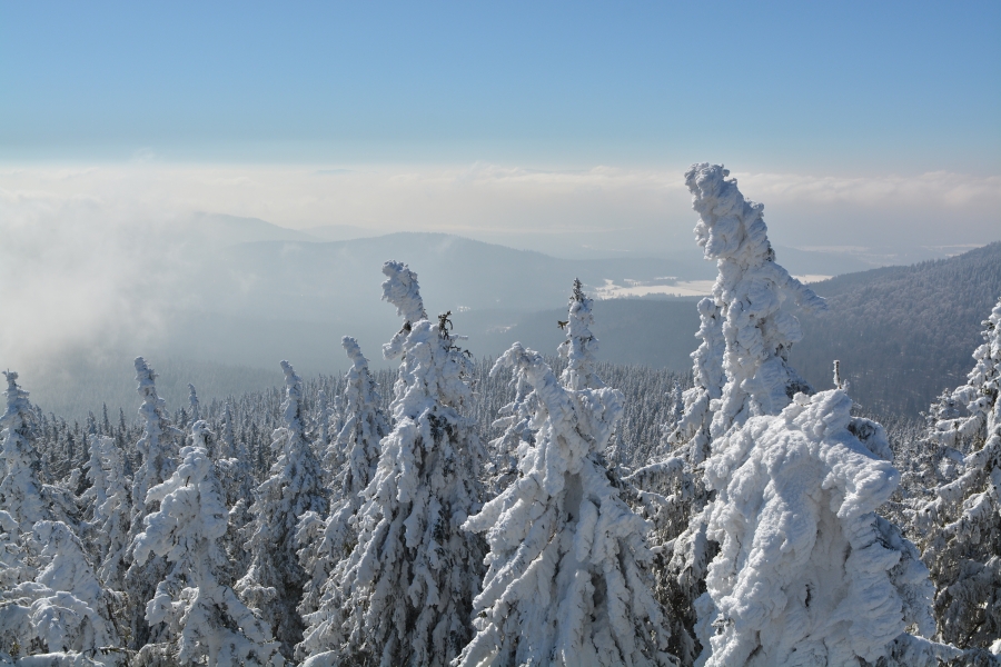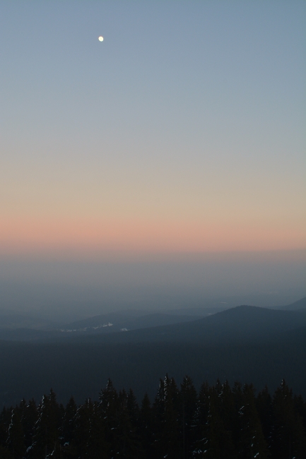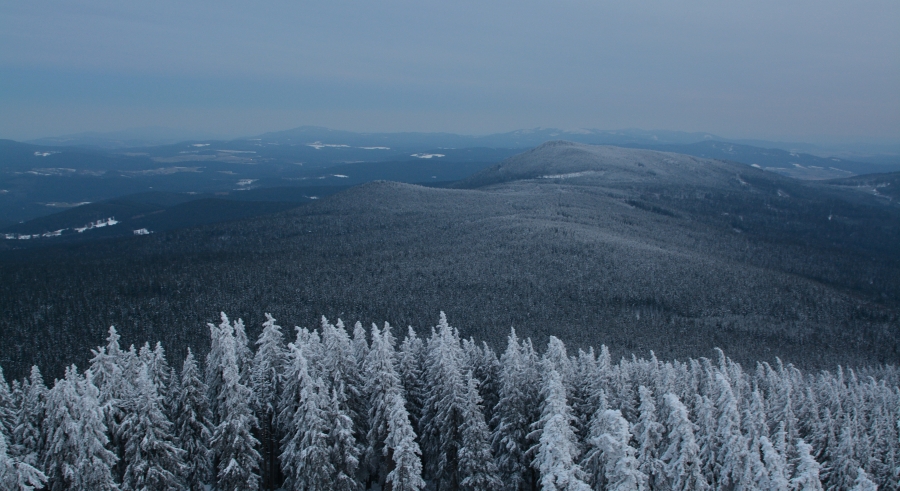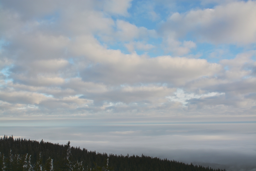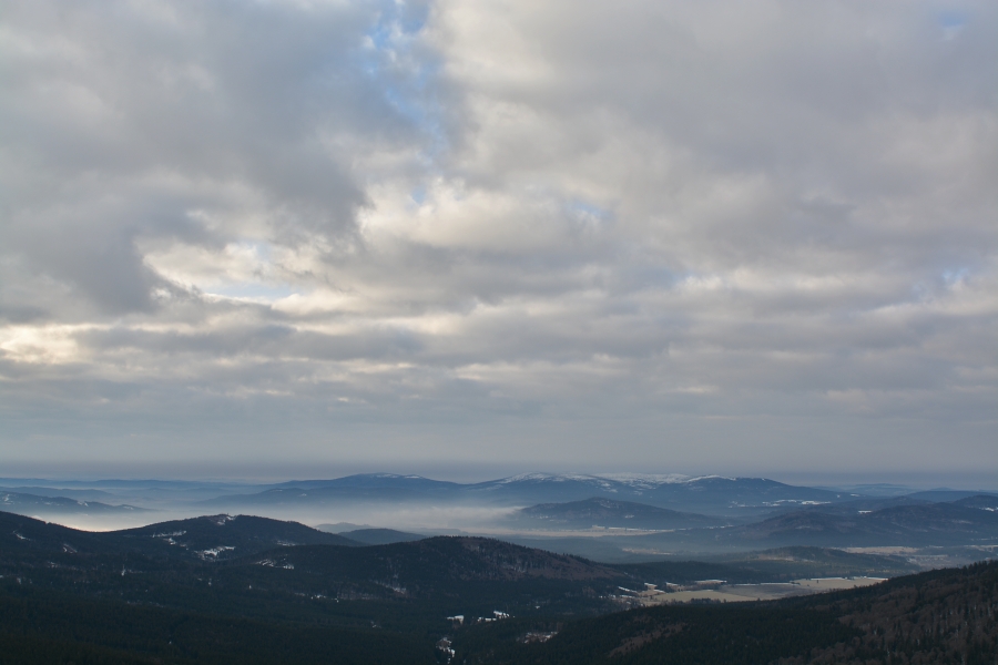 Mnohem více běloby je k nalezení na Trojmezenské hornatině, za níž lze vpravo dobře pozorovat tmavší souvislý pás všude tam, kde by se za lepší viditelnosti objevily Alpy.