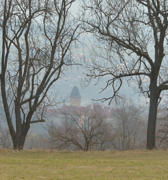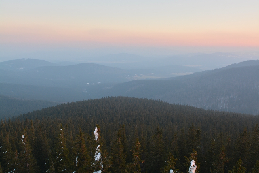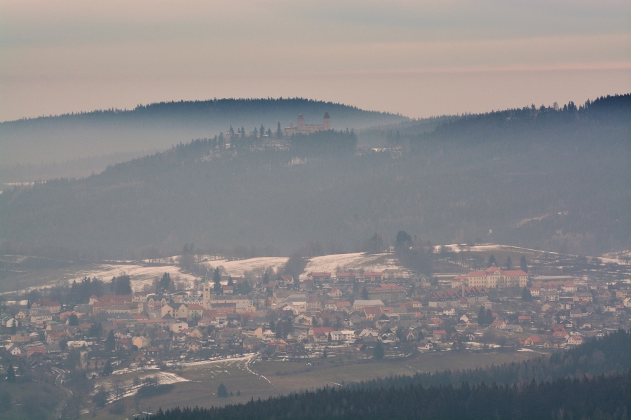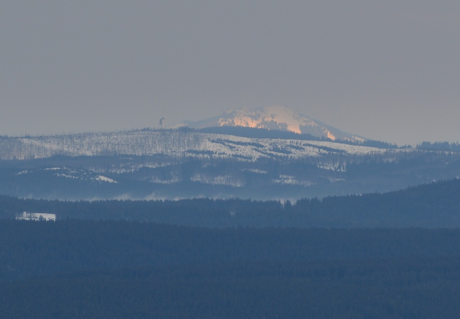 Dařilo se mu to i tam, kde do celkové atmosféry promlouval přízemní mlžný opar, zde třeba lehce halící Kašperské Hory včetně slavného hradu nad nimi. Pohled opačným směrem z dobře na obzoru viditelné rozhledny na Sedle byl v ten čas bezesporu zajímavější, …