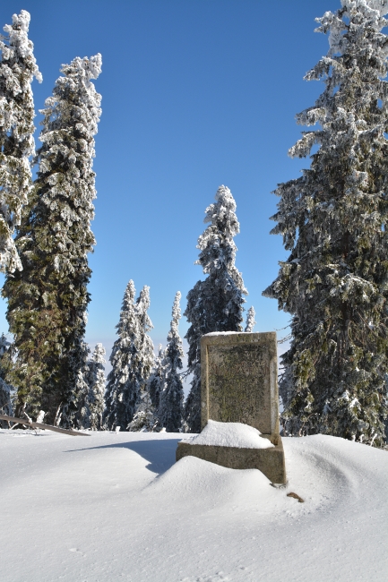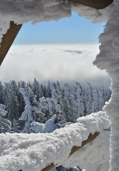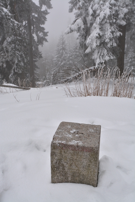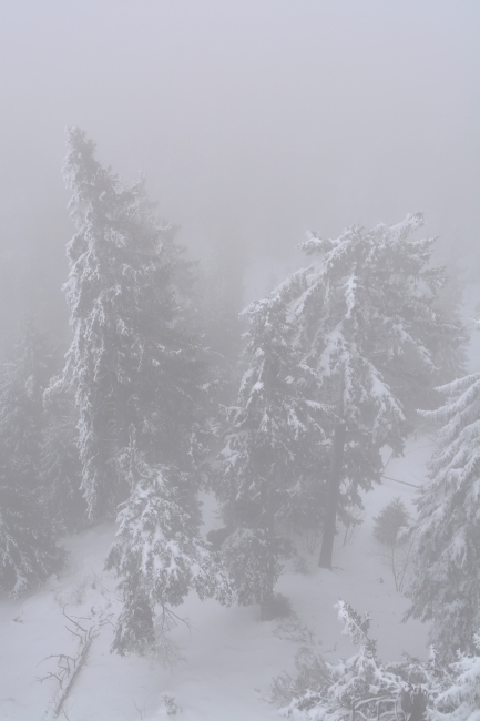 Po včerejším vývoji šumavského počasí nepřekvapila ani jeho další návaznost, takto dnes vyhlížející třeba v pravé poledne na Boubíně. Cesta sem započala za čtyřstupňové vimperské teploty a na rozhledně vyústila pro změnu do čtyřstupňového mrazíku. Jemné dopolední mrholení se už nad Kubovkou, vykazující přesně bod mrazu, proměnilo v drobný sněhový poprašek, jenž na boubínském vrcholu nabyl podoby ostrých ledových jehliček, před nimiž bylo i v relativně mírném západním větru nutno často mhouřit oči. Těm se ostatně v uvedený čas nenabízelo k vidění více, než co zobrazují snímky.