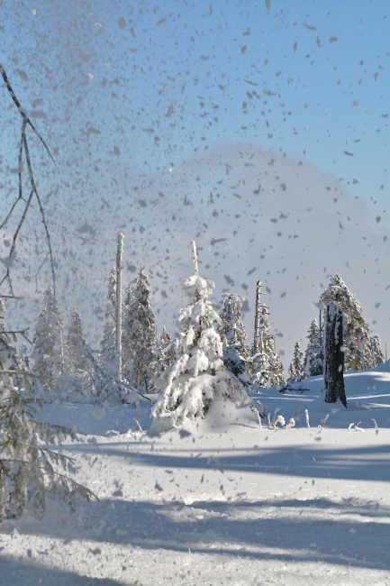 … čímž se ostatně s náležitou pýchou pochlubila za jednoho z posledních dnešních lehkých projasnění oblohy o něco dále i měřící tyč. Ačkoli přímo u ní dobře vidíme, že aktuální naměřená hodnota je mírně zkreslená, i po nutné korekci dojdeme jejím porovnáním s předchozími k patnácticentimetrovému sněhovému přírůstku. Celková hloubka zhruba čtyřiceti centimetrů ovšem převažující boubínské realitě neodpovídá.