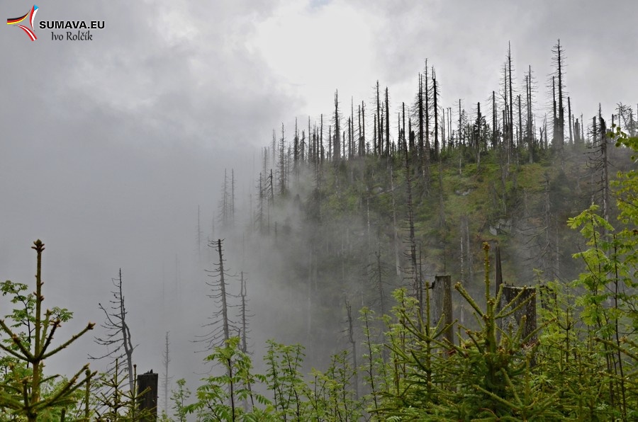 I přesto je na hřebenech vláhy a vlhkosti dostatek, což dokládají snímky z 2. června z okolí vrcholu Plechý. Oblačnost nízkých pater znemožňuje výhledy do kraje, i tak ale má toto počasí své kouzlo. Oblačnost se převaluje přes hřebeny a skouzává do údolí, vegetace je v těchto dnech krásně zelená, úplné ticho čas od času přeruší zpěv ptáků.