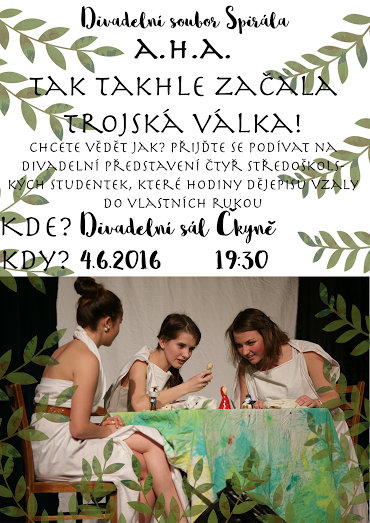 je nové představení divadelního souboru Spirála působícího při vimperském gymnáziu (momentálně v čistě dívčí sestavě). Pohrály jsme si s motivy antických bájí i se svými vlastními radostmi a starostmi a na svět přišla hra, která vám během půlhodinky ukáže, jak to asi mohlo být s Paridovým soudem a proč vlastně došlo k Trójské válce. Zatím máme za sebou předpremiéru ve Vimperku a účast na festivalu středoškolského divadla Mladá scéná v Českém Krumlově, odkud jsme si přivezly i ocenění za nejlepší scénář . Pokud byste si nechtěli nechat naše představení ujít, zveme vás v sobotu do Čkyně (19:30 – kinosál).
