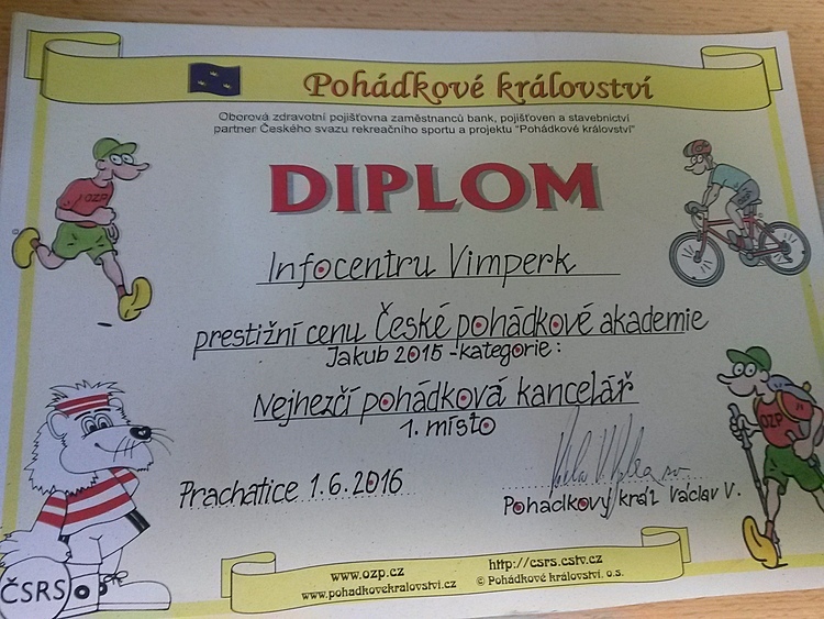 V kategorii Nejhezčí pohádková kancelář se na krásném prvním místě umístila kancelář Turistického informačního střediska Vimperk. Vedoucí Petra Hrušková převzala diplom a cenu z rukou samotného krále Pohádkového království pana Václava Vydry. Pomyslné žezlo pro pořádání 15. ročníku Pohádkového dne převzaly zástupkyně města Týna nad Vltavou, které se této akce ujme v roce příštím. A již nyní se můžeme pomalu začít těšit na rok 2018, kdy by se 16. ročník Pohádkového dne měl uskutečnit ve Vimperku.