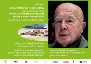 U příležitosti zahájení letní turistické sezóny zveme milovníky Šumavy ke křtu kalendáře pro rok 2017 Bučina a Kvilda v ilustracích, za účasti kmotra akce, šumavského