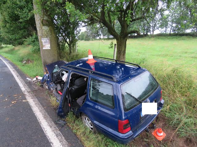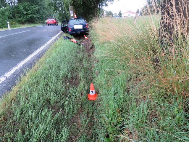 Z dopravní nehody je důvodně podezřelá 40letá řidička osobního vozidla VW Golf, která nezvládla řízení vozidla a z dosud nezjištěných příčin vyjela s vozidlem vpravo mimo komunikaci do silničního vodotoku a následně čelně narazila do stromu. Po dopravní nehodě zůstala řidička zaklíněná ve vozidle. Po jejím vyproštění musela být s těžkým zraněním transportována na traumatologické oddělení do nemocnice. Dále došlo k lehkému zranění spolujezdce ze zadního sedadla. Hmotná škoda na vozidle je odhadem 40 000 korun. Bližší okolnosti dopravní nehody, včetně zjišťování přítomnosti alkoholu u řidičky, budou výsledkem dalšího šetření dopravních policistů.