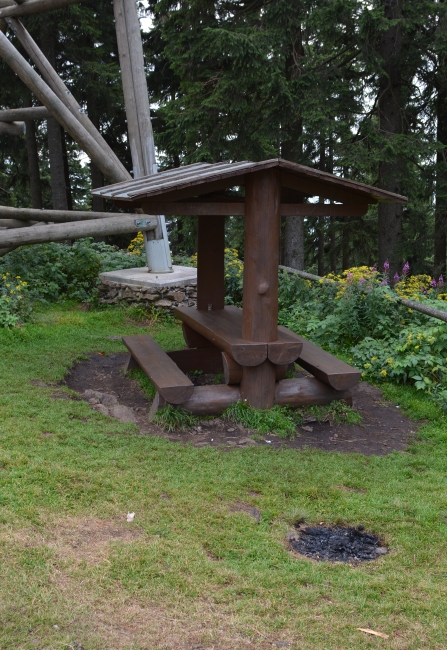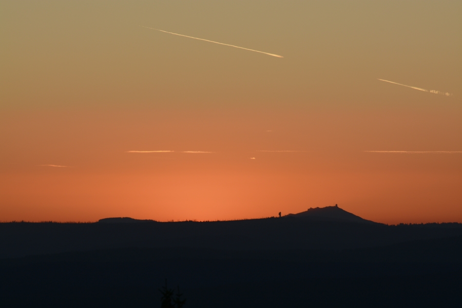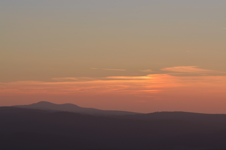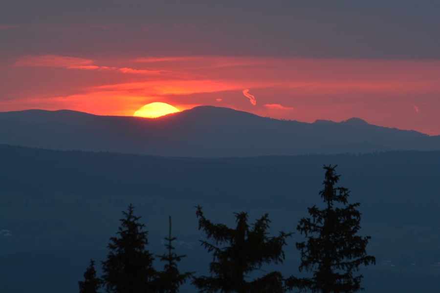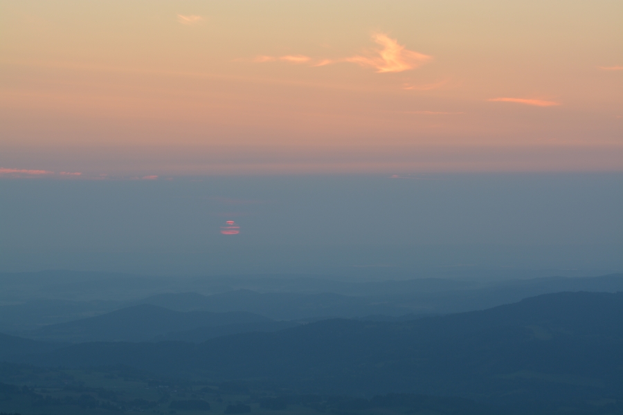 … přes jehož zvolna se již zplošťující vrchol navíc klesající sluníčko opřelo antikrepuskulární paprsek, opticky momentálně dosahující nad České Budějovice. Panuje tu osmnáctistupňové teplo spolu s velmi vítaným slabým vánkem, mírnícím prvotní neodbytný pocit dusna, jež provázelo celý výstup sem (startovní teplota ve Vimperku činila šestadvacet stupňů).
