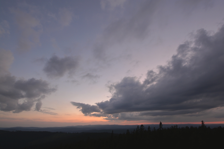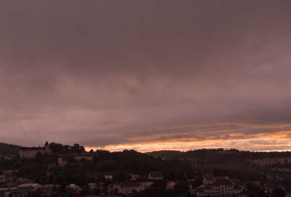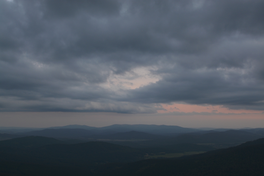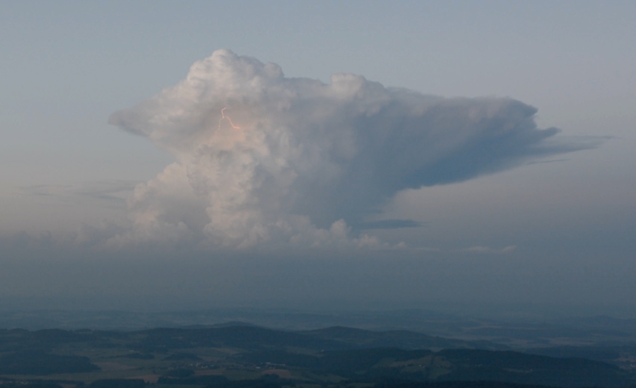 Pondělní ráno skutečně náleželo další bouřce a dopoledne se neslo ve znamení vydatného zalévání. Tím pádem došlo i na očekávané ochlazení. V odpoledních hodinách se však v šedé oblačnosti začaly stále častěji objevovat modré trhliny, až se navečer téměř dokonale vyčasilo. Chvilku před slunečním západem ale severní obzor náhle vzbudil domněnku, že se v mírně menším provedení zopakuje včerejší scénář, viděný z Boubína. Tento náběh na kovadlinu se ovšem namísto blýskání a hromování postupně rozplynul, čímž daroval poslednímu srpnovému pondělnímu večeru po velmi pestrém dni poklidný průběh s vyhlídkou na opět krásný příští den.