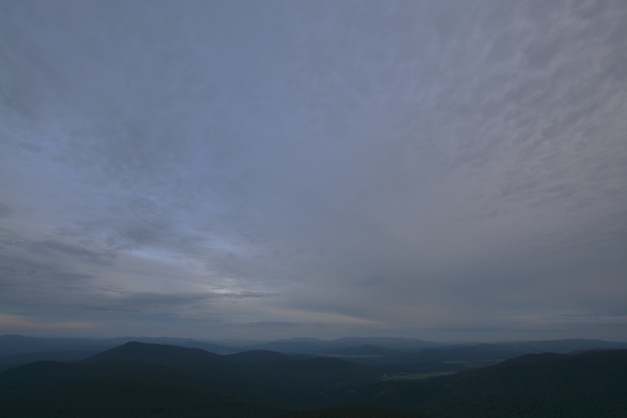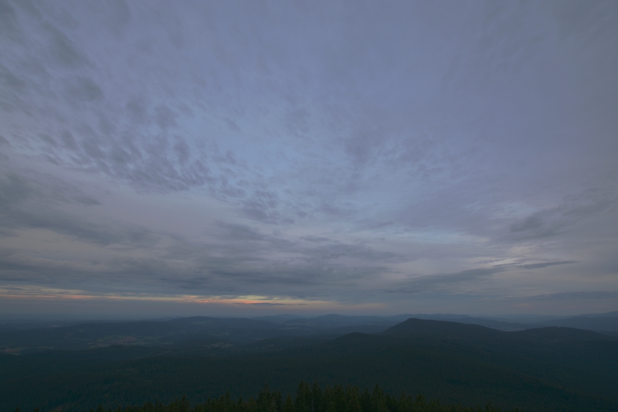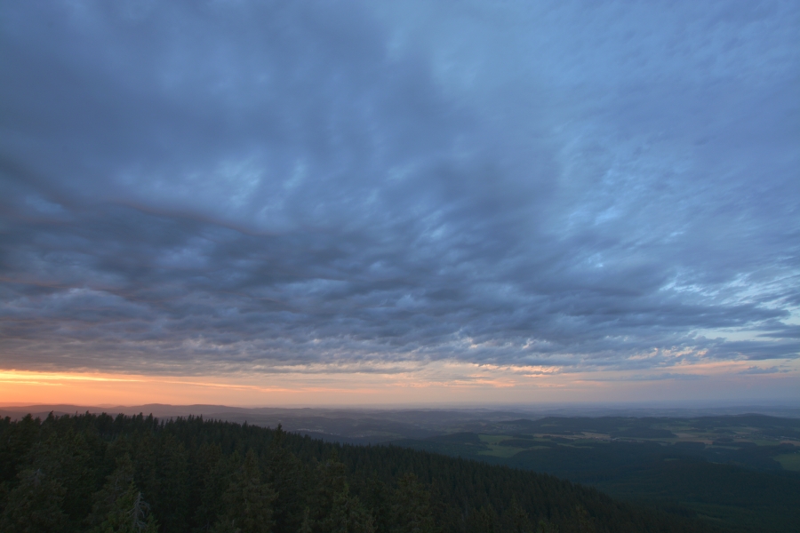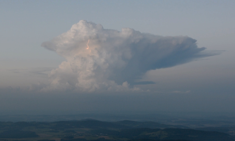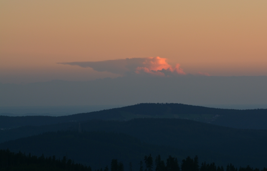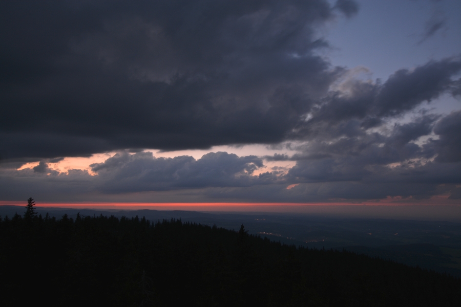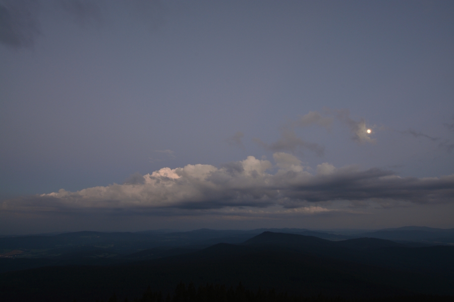 Teploty nám dnes opět výrazně připomněly, že i devět dní po svaté Anně se můžeme naplno těšit parnému létu. Zajímavé pak bylo zejména celodenní dění na obloze, chvílemi protkané pestrou bělostnou oblačnou nadílkou, střídající se ovšem se zcela čistým blankytem, nejvýstižněji charakterizovatelným jako „vymeteno“. A právě to panovalo nad hlavou v průběhu večerního výstupu na Boubín, odkud pak tím překvapivěji zapůsobilo bezprostředně následující nebeské představení.