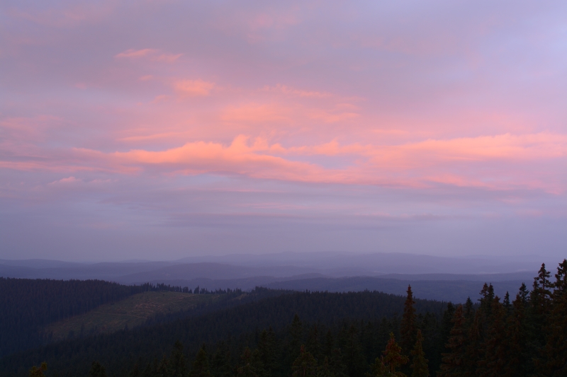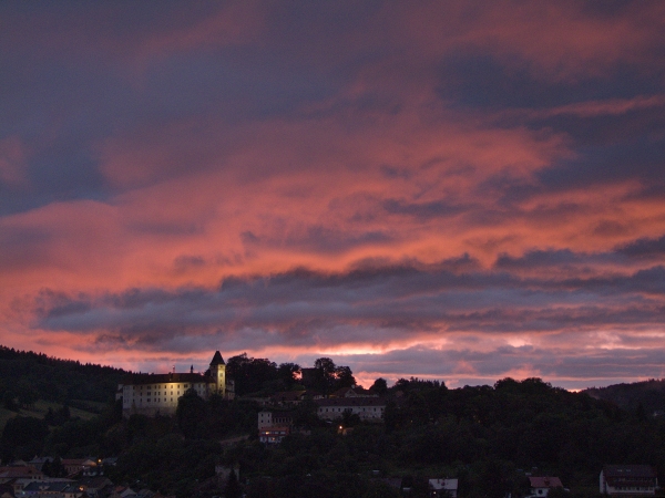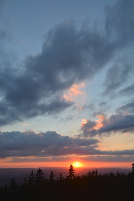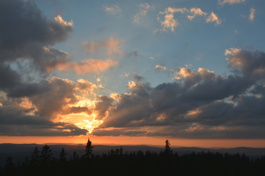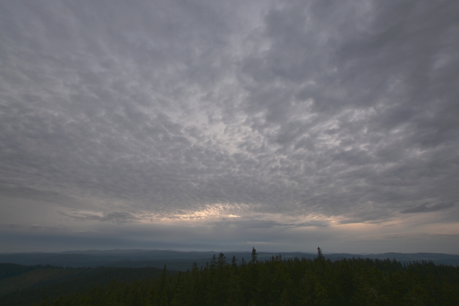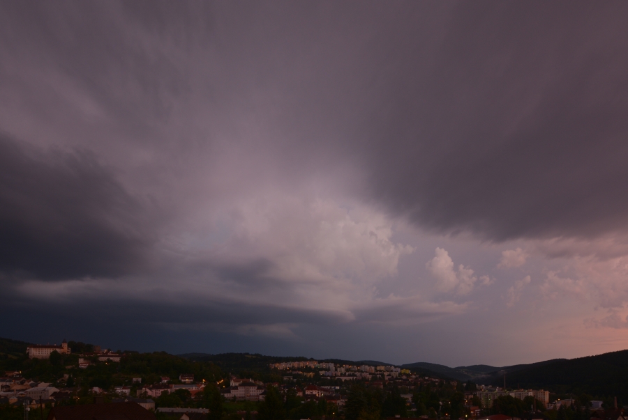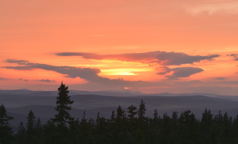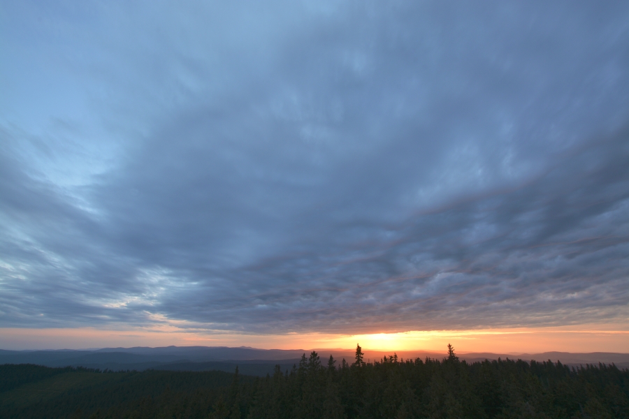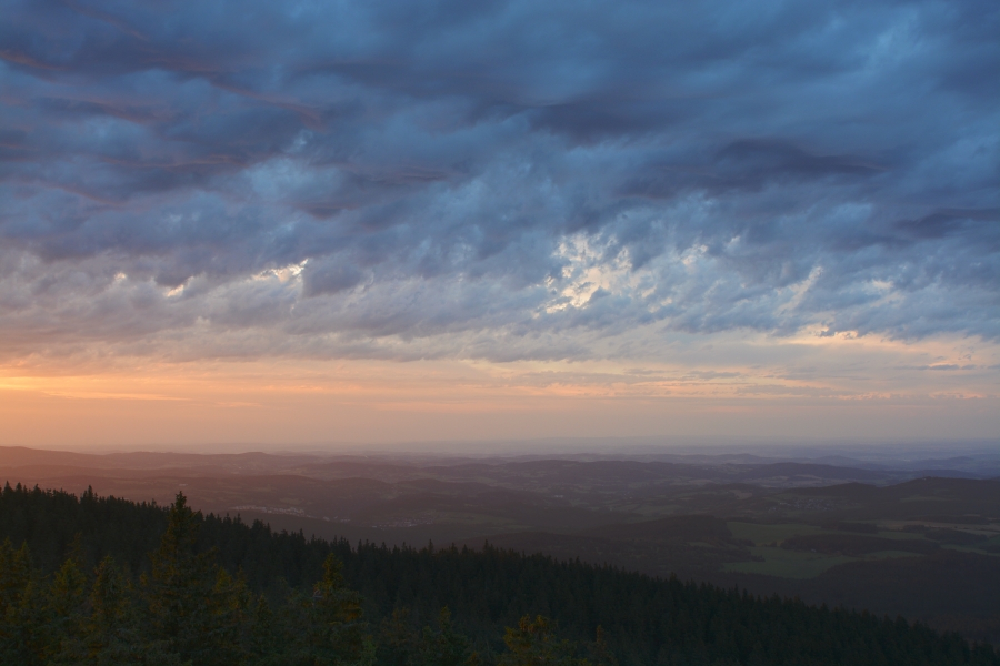 Teploty nám dnes opět výrazně připomněly, že i devět dní po svaté Anně se můžeme naplno těšit parnému létu. Zajímavé pak bylo zejména celodenní dění na obloze, chvílemi protkané pestrou bělostnou oblačnou nadílkou, střídající se ovšem se zcela čistým blankytem, nejvýstižněji charakterizovatelným jako „vymeteno“. A právě to panovalo nad hlavou v průběhu večerního výstupu na Boubín, odkud pak tím překvapivěji zapůsobilo bezprostředně následující nebeské představení.