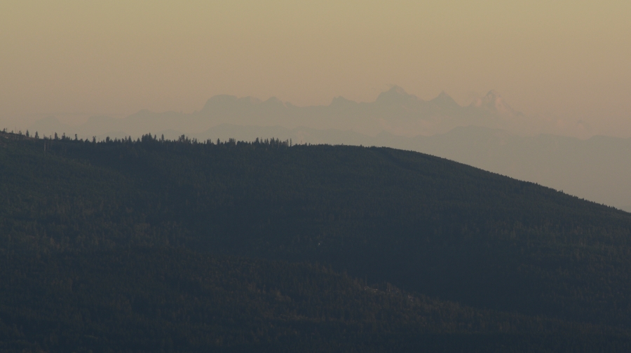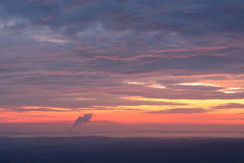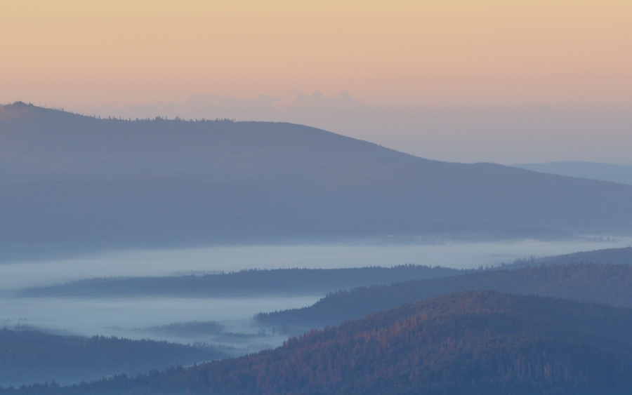Poslední, krásně slunečný srpnový den zdobila naprosto čistá blankytná obloha, avšak s ohledem na dané období se přihlásil citelně chladnějším ránem s přízemními mlhami. Večer pak pro změnu přinesl jemný, ale nepřehlédnutelný obzorový opar s letmo rozhozenými mráčky, takže prvním pohledem se zdálo, že Boubín předloží k smysluplnému fotografování nanejvýš větší krajinné celky, na nichž klesající sluníčko ještě provede svá tradiční kouzla světel a stínů, nežli nám pošle poslední letošní prázdninový pozdrav před svou každodenní cestou do zámoří. Soustředěný pohled však naopak poměrně překvapivě prozradil, že dnes bude slavit hody právě především dlouhé sklo. Ukázalo se totiž, že nejnápadnější mráčky nad Třístoličníkem halí známé vrcholy dachsteinského masivu, přičemž lze rozeznat východně navazující alpský pás, …