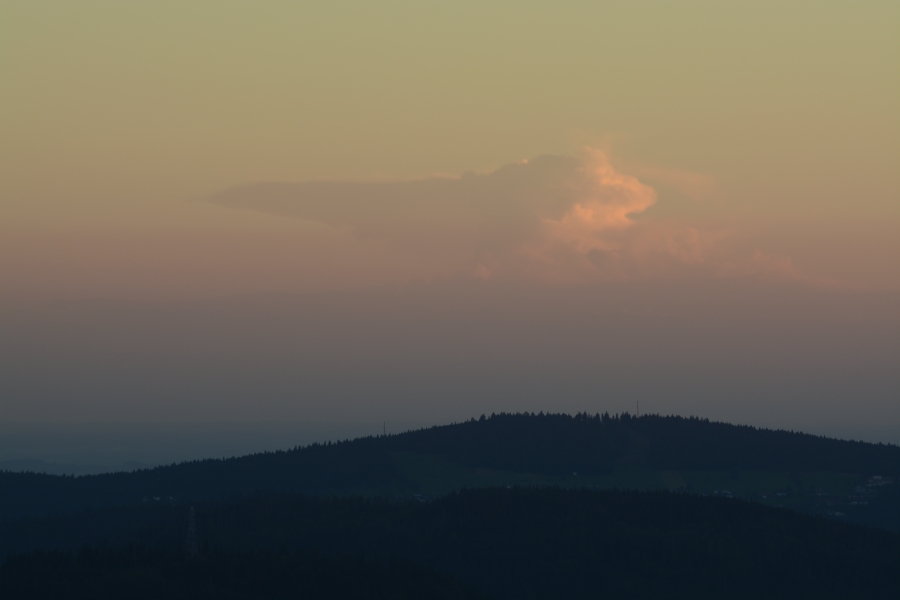 Mezi druhou a třetí hodinou ranní, kdy byly pořízeny předchozí dvě astrofotografie, se sotva dalo odhadnout, jak velké bohatství přírodních zážitků tato poslední srpnová neděle nabídne. Uchystala opět nefalšované letní parno, ale poměrně brzy též začala oblohu plnit oblačností, jež po poledni nabyla docela slušných rozměrů. Jelikož však současně mírnila nejprudší sluneční žár, nikomu asi nevadila. S podvečerem jí celkově mírně ubylo, jen na východní straně narostl osamělý mohutný cumulonimbus. A když už pozorovat zajímavé mraky, pak nejideálněji z Boubína. Tam se tenhle fešák nějakých dvaadvacet minut před západem sluníčka skutečně skvostně vybarvil a zjevně chystal shora postupnou proměnu v typickou bouřkovou kovadlinu.