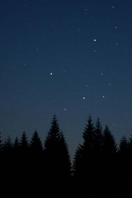 Fotografové si na dané téma při výsledném zpracovávání snímků zpravidla nenechají ujít příležitost k nejrozmanitějšímu efektnímu „laborování“, na jehož základě se divák zákonitě táže, proč něco takového na noční obloze reálně nevidí. Tak třeba již jen prodloužením expozičního času získáme vedle nemalé barevné variability hned dva důkazy – předně o nedokonalosti lidského zraku, jemuž zůstává oproti fotoaparátu skutečné hvězdné bohatství vesmíru značnou měrou utajeno, a též o zemské rotaci, neboť hvězdy se nám už opticky jeví nikoli jen jako světlé body, nýbrž v závislosti na vzdálenosti od nás většinou spíše jako kratší či delší úseky soustředných kružnic (zde zatím ještě miniaturní, ale porovnejme si vše se včerejším prvním snímkem z Boubína), rotujících kolem Polárky (či, chceme-li, Severky). Nu a majitelům mimořádně silné fantazie pak jistě neunikne, že z Mléčné dráhy se na nás dívá celá řada nejrozmanitějších tajemných tváří, často plynule přecházejících jedna v druhou, ba dokonce lidská ve zvířecí a naopak … 🙂