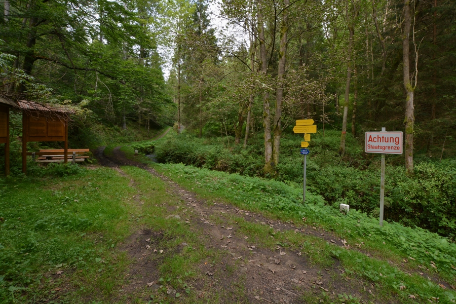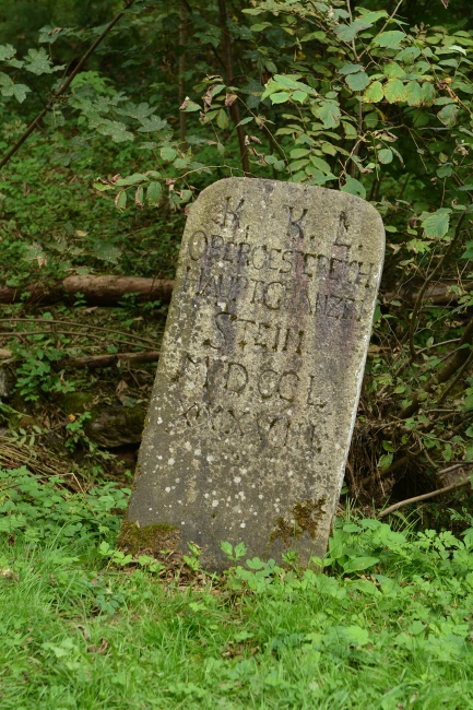 V místě, kde stezka odbočuje k rakouské obci Sankt Oswald, nás očekává dochovaný historický hraniční kámen z roku 1788 …