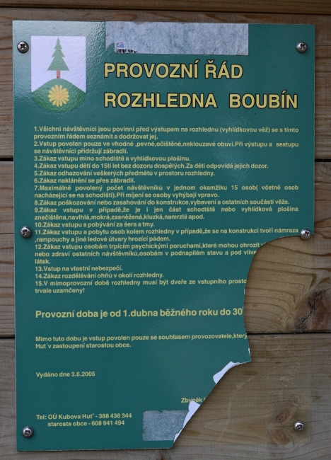 … a konečně i houstnoucí mokrou mlhou, kterou přinášel tentokrát severní vítr. A právě mlha, omezujíc prostor k zrakovému vnímání, se logicky zasloužila o opačný efekt v oblasti sluchové. Vítr totiž v závislosti na své síle občas rozeznívá na principu Panovy flétny duté kovové konstrukce informačních tabulí na zábradlí vyhlídkové plošiny rozhledny. Za nárazových větrů nebo vichřic je tu možno slyšet přímo vícehlasé kvílení či jekot, kdežto klidnější proudění vyluzuje tóny hlubší a příjemnější. Pokud se však člověk nachází v zajetí krásných výjevů, zpravidla se na doprovodné zvukové efekty, resp. jejich analýzu plně nesoustředí. Dnes tomu ovšem bylo jinak – vítr náležel k druhým jmenovaným, a tím pádem vydával lahodně znějící tóny, jejichž melodická posloupnost tvořila sestupný rozložený kvartsextakord v tónině H dur. Rozhledna tak sice vinou mlhy neplnila své prvotní poslání, zato však libě muzicírovala.