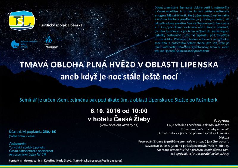 Turistický spolek Lipenska společně s Českou astronomickou společností, Astronomickým ústavem Akademie věd ČR a obcí Stožec pořádá atraktivní vědecký seminář, který bude popisovat fenomén tmavé oblohy a to zejména v souvislosti s tématem astroturistiky. Přijeďte si užít tmu a hvězdy, které se jen tak nevidí. Některé obce na Lipensku chtějí začít lákat turisty na tmu s jasným hvězdným nebem. Na takovou, jakou si lidé z měst kvůli světelnému znečištění nemají doma šanci užít. Turistický spolek Lipenska (TSL) společně s Českou astronomickou společností, Astronomickým ústavem Akademie věd ČR a obcí Stožec pořádá v říjnu atraktivní vědecký seminář, který bude tento fenomén popisovat a to zejména v souvislosti s tématem astroturistiky.
