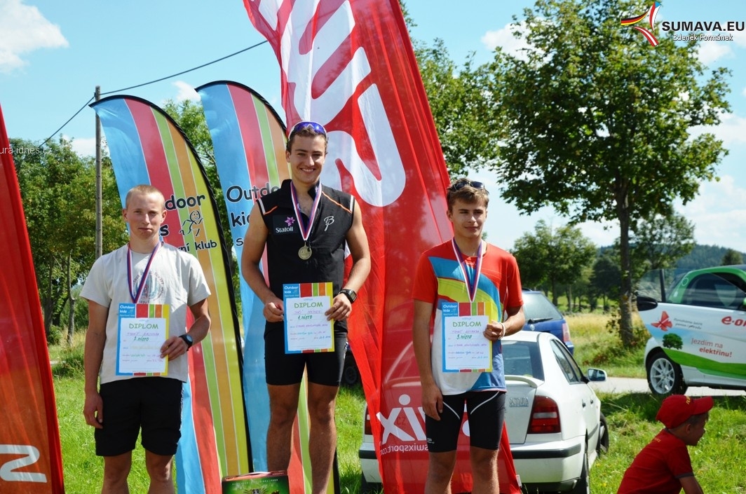 Jiří Mánek (1.) a Tomáš Kalivoda (2.) na stupních vítězů po závodě na kolečkových lyžích O pohár krušlovského medu, kterého se oba účastnili bezprostředně po příjezdu z Norska tuto sobotu v Krušlově. Dnes už oba trénují v Italském Livignu.