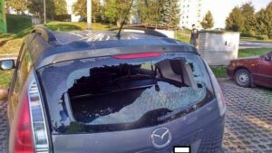 Osobní automobil zaparkovaný na sídlišti někomu opravdu vadil. Pro majitele tohoto osobního automobilu není sobotní ráno zrovna růžové. (foto: Zdeněk Formánek,