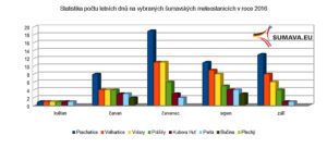 Teplota vzduchu s nadmořskou výškou postupně klesá. S tím úzce souvisí i počet letních dnů během kalendářního roku. Vybrali jsme 8 šumavských meteostanic z různých
